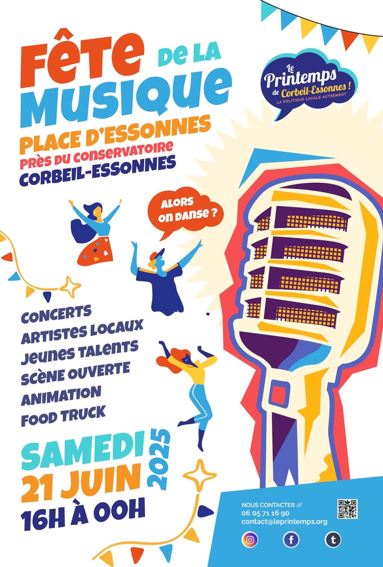 Nous invitons toutes les personnes souhaitant participer à cet événement à nous contacter. Que vous soyez un musicien solo, un groupe de musique ou tout simplement un amateur désireux de partager votre passion, la fête de la musique est l’occasion idéale pour faire entendre votre voix. Ce moment de rassemblement est une plateforme parfaite pour promouvoir le talent local. La musique a ce pouvoir incroyable de rassembler les gens, de créer des connexions, et quoi de mieux pour célébrer cela qu'au printemps de Corbeil-Essonnes ?